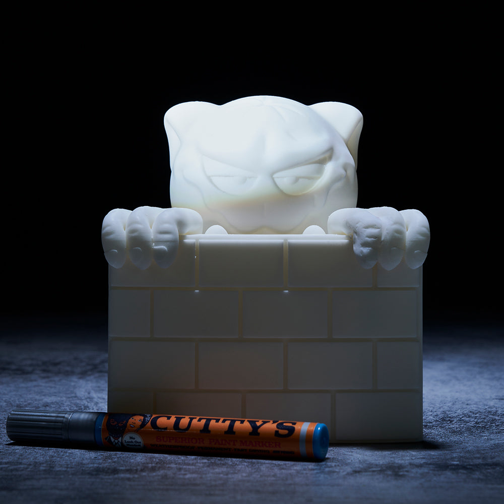 Limited Edition Cutty Buddy Blankface DIY Figure. Character design by L.A. based artist Polo Cutty (Sida). Features a "ready-to-paint" all white 7”vinyl-resin figure. Figure includes a detachable brick wall to serve as an art canvas.