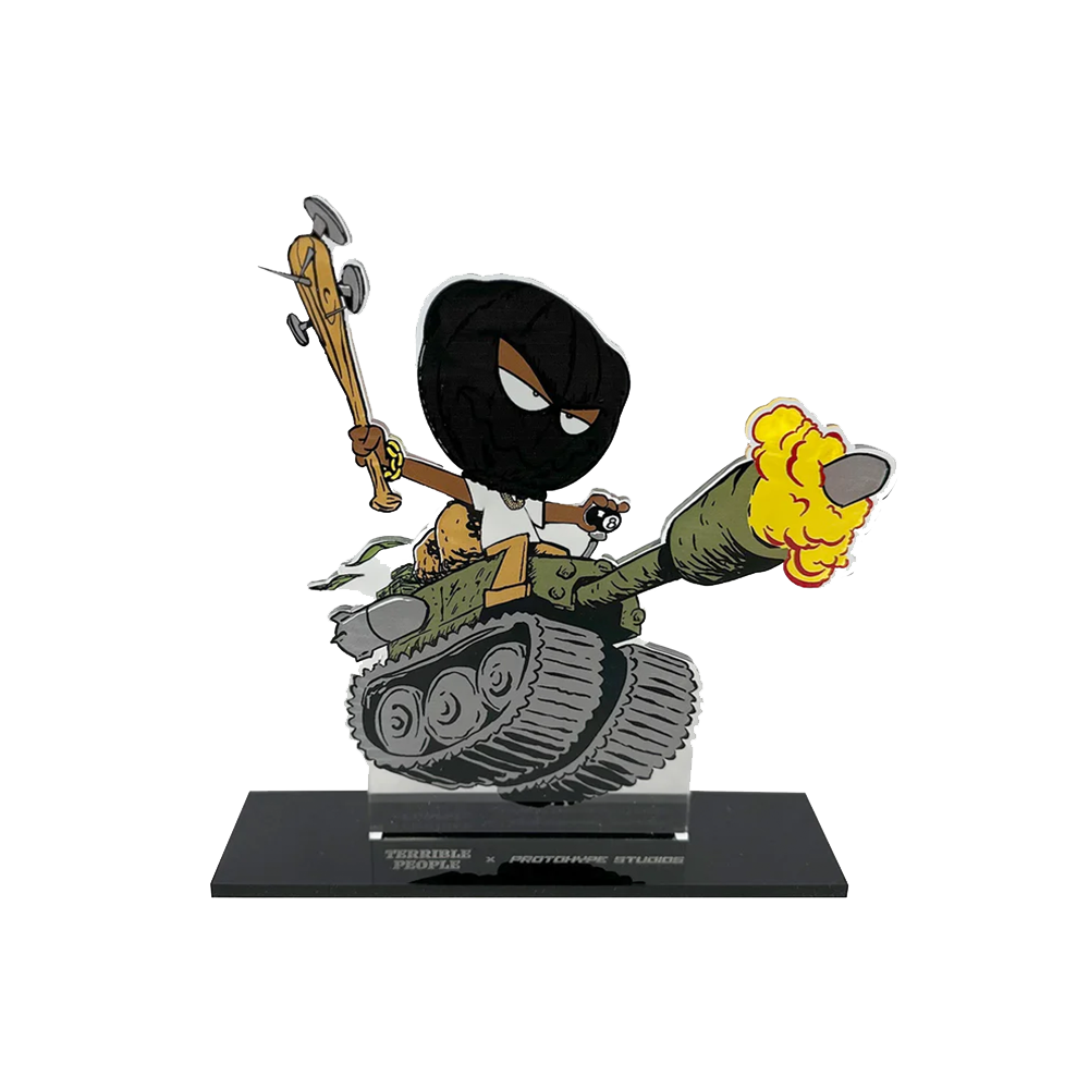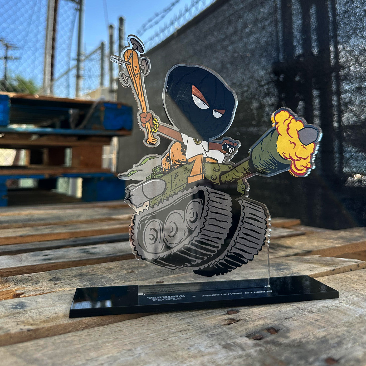 Limited Giclée print of Cutty on a Tank. Made of 1/4" inch clear acrylic. Graphic print on both sides. Black base included.