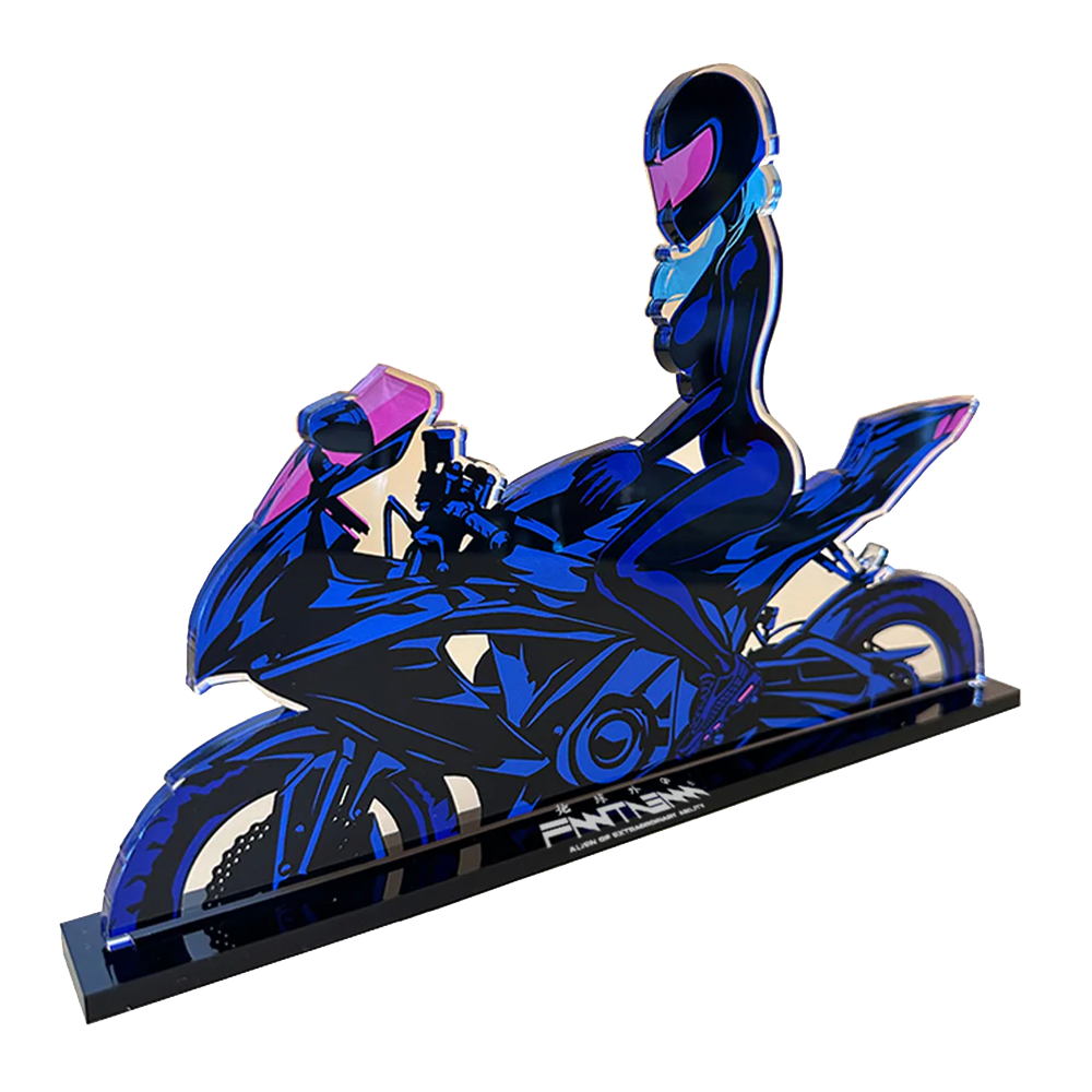Limited Giclée print of Fantasma on Bike. Made of 1/4" inch clear acrylic. Graphic print on both sides. Black base included.