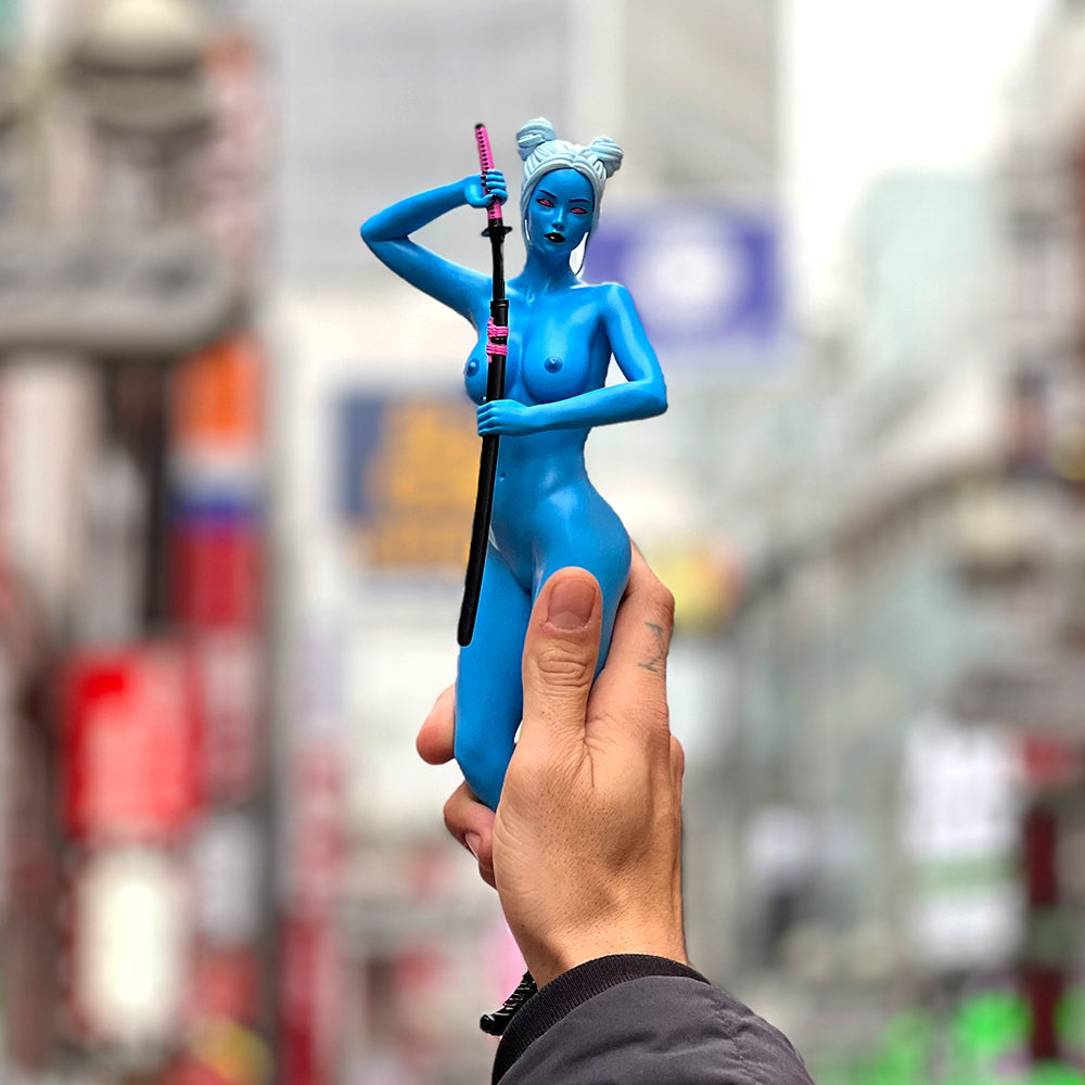 Haunt’s signature FANTASMA character, as seen on wall murals throughout Los Angeles, stands 12” tall with a statuette base. Finished with fine details, from her eyeliner to the delicate patterning of the katana sword, this figure is a true polished beauty!
